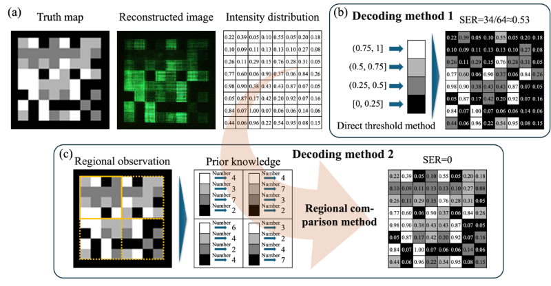 | 图2. 数据页的编码和解码过程。(a)四阶数据页的真图,通过记录介质重建的图像,重建图像的 归一化强度分布;(b)传统的直接阈值的解码方法;(c)提出的区域比较解码方法 |