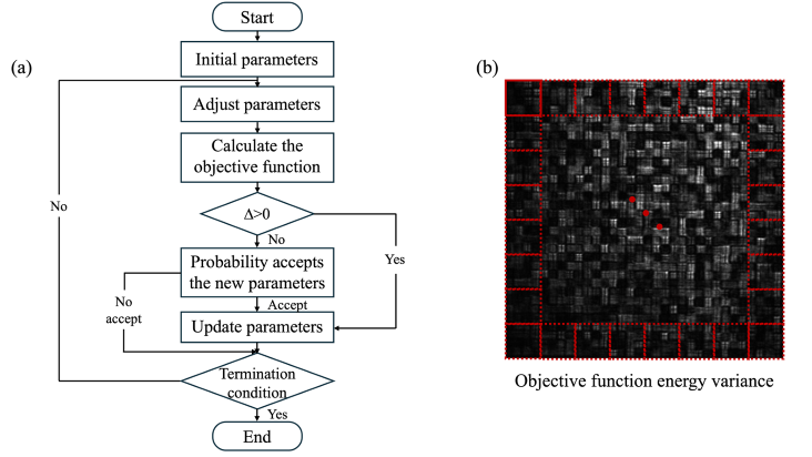 其次,引入自适应同态滤波技术,针对介质非均匀性引起的图像失真进行校正。该方法基于图像形成乘法模型,通过对数变换、傅里叶变换和高斯滤波器压缩动态范围并增强细节对比。同态滤波工作流程分离照明和反射成分,实现强度分布均匀化。针对不同数据页的能量包络差异,自适应机制以编码单元总能量方差作为评价指标(如图3),动态优化滤波参数。优化过程采用迭代扰动和概率接受,确保滤波失败避免。图4 显示,390 张重建图像的平均强度分布方差从 0.0454 降至 0.0187,能量包络更平滑。 |