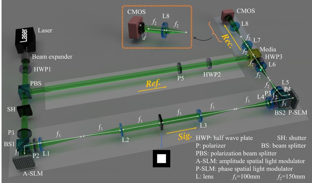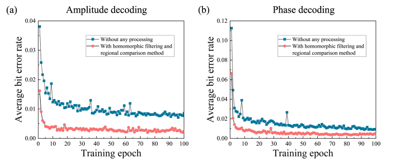 复振幅全息数据存储系统如图5 所示,使用振幅 SLM 和相位 SLM 加载数据页,通过 PQ/PMMA 介质记录和重建,CMOS 传感器捕获重建图像。数据集包括 390 张图像,使用 U-Net 网络训练。解码结果显示,使用区域比较方法,振幅和相位错误率分别降低 53% 和 47%(如图6 所示)。结合自适应同态滤波后,错误率进一步下降,振幅和相位解码准确率分别提升 71.9% 和 62.5%,如图7 所示。图8 比较了直接阈值法、区域比较法及结合比较和滤波的三种方案的解码性能,明确了协同优化的带来的提升。 |