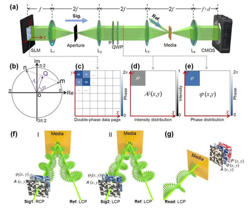 | 图1 多维光场调制概念图。(a) 全息数据存储系统示意图,(b) 复振幅双相位分解复平面示意图, (c) 用于两个相位值 m 和 n 的棋盘图案的示例,(d) 像平面处的强度分布示例,(e) 像平面处 的相位分布示例,(f) I. 第一次记录:RCP 信号光束和 LCP 参考光束之间的干涉记录了复 振幅 A(x, y)exp[iφ1(x, y)];II. 第二次记录:LCP 信号光束和 LCP 参考光束之间的干 涉记录了复振幅 A(x, y)exp[iφ2(x, y)],(g) 读取:用 LCP 读取光束照射介质。 |