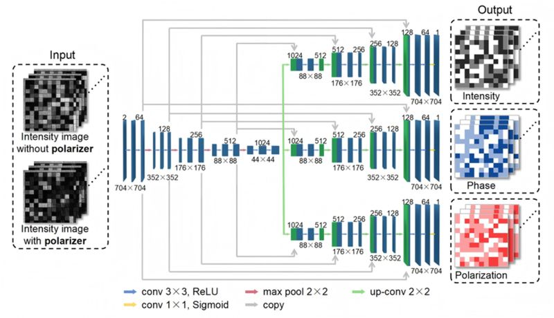 为应对上述挑战,本研究采用数据驱动的解码方法,结合图像分割的数据增强策略,引入卷积神经网络对多维光场进行联合反演。通过端到端训练,网络能够建立衍射强度分布与振幅、相位和偏振编码之间的高维非线性映射关系,从而为多维信息的同步解码提供切实可行的解决方案。基于此,本文提出了一种面向多维光场解码的双输入三输出卷积神经网络架构— TriDecode-Net,其结构如图4 所示。该网络可直接从两幅互补的衍射强度图像中同步恢复振幅、相位和偏振信息。其中,一幅输入图像在无检偏器条件下采集,主要反映重建光场的振幅分布;另一幅则在竖直取向检偏器作用下获取,其强度分布同时受振幅与偏振调制,并遵循Malus定律。此外,两幅图像均包含由相邻数据点间的边缘衍射和干涉特征。通过引入这对互补图像,网络能够获取更全面的光学信息,为多维解码提供更加充分的输入。训练完成后的 TriDecode-Net 重建结果如图5 所示,其中振幅、相位和偏振的平均误码率分别为 0.0094、0.0279 和 0.0155。 |