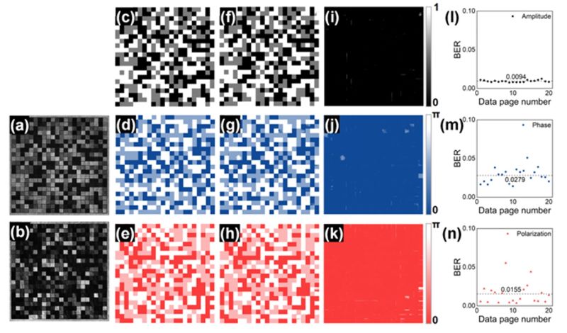 本研究基于团队在张量偏光全息理论的长期积累,为技术实现提供了坚实基础。本文首次提出并实验验证了振幅、相位与偏振三种基本光学维度的联合编码与解码方法,实现了全息数据存储容量与速率的提升。该多维调制与重建技术不仅适用于高密度数据存储,还可拓展应用于光学加密、防伪认证、大容量光通信以及结构光生成等领域。 |