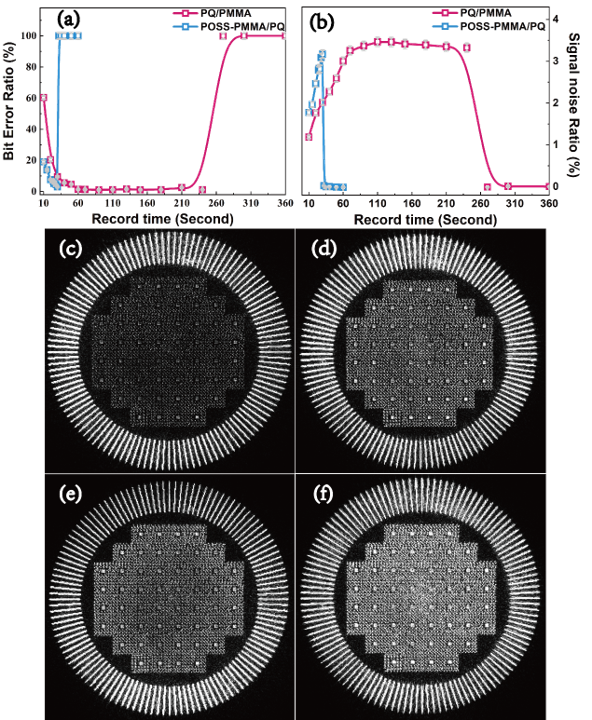 经过同轴全息存储系统的数据存储验证发现,POSS-PMMA/PQ材料可以在较短时间内(~30s)完成较低误码率(BER)和较高信噪比(SNR)的二维数据页存储。并且,由于感光灵敏度和衍射效率的提升,在相同读取光强条件下,POSS-PMMA/PQ材料更容易达到过饱和曝光量(衍射光栅强度较高造成读取信号太亮导致无法计算SNR的结果)。结果如图4(a-f)所示。