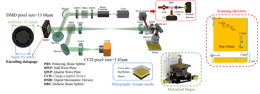 在大数据时代,信息的指数级增长使高效、低成本的数据存储成为研究热点。全息数据存储凭借体全息技术将二维编码数据页存储于三维全息介质中,兼具超高存储密度与快速传输速率的优势,被视作下一代数据存储技术的有力竞争者。全息数据存储的高容量优势源于复用技术,而所有复用技术的核心均基于体全息光栅的布拉格失配原理。但在数据读取阶段,必须严格满足布拉格条件才能获得可靠数据。因此在实际系统运行中,记录物镜的平移、离焦以及存储介质的倾斜等光轴偏差,都可能破坏布拉格匹配,导致衍射强度衰减、信噪比下降和误码率升高。