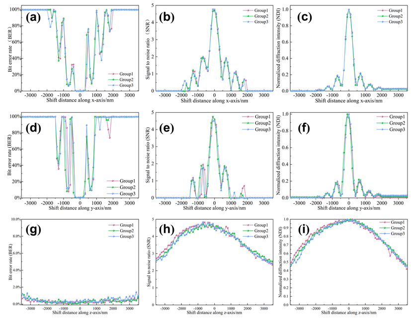 (g)-(i) 显示了 z 轴偏移距离与重建数据页的 NDI、SNR 和 BER之间的关系