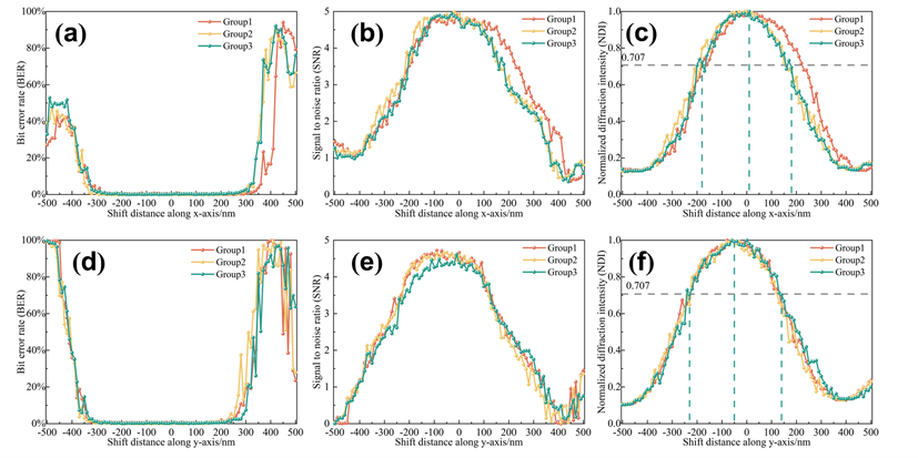 BER之间的关系,(d)-(f) 显示了 y 轴偏移距离与重建数据页的 NDI、SNR 和 BER 之间的关系