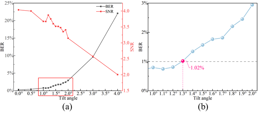 图4 数据重建误码率随介质倾斜角度变化的曲线。(a) 显示了倾斜角度范围内误码率和信噪比随倾斜角度的变化趋势;(b) 显示了误码率在倾斜角度1-2°范围内随倾斜角度的变化趋势
