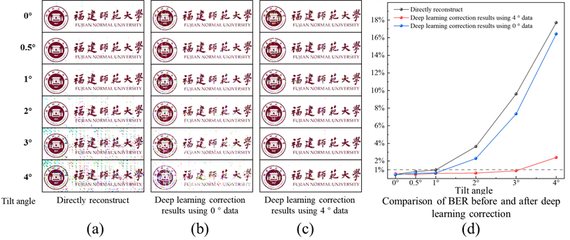 针对这一问题,研究团队提出基于 U-Net 卷积神经网络的深度学习校正方法。校正前后数据重建情况对比如图5 所示,通过 1100 组编码数据页的训练与测试,该网络能够精准提取介质倾斜导致的畸变特征,无需额外机械结构即可实现偏差校正。实验显示,校正后系统的倾斜角容限提升至 3°,是未校正系统的 2.3 倍,远超传统蓝光光盘 0.3°-0.6° 的倾斜角要求。更重要的是,该方法在软件层面完成优化,无需增加硬件复杂度,同时可同步消除光学系统像差与介质响应噪声,兼顾了实用性与高效性。